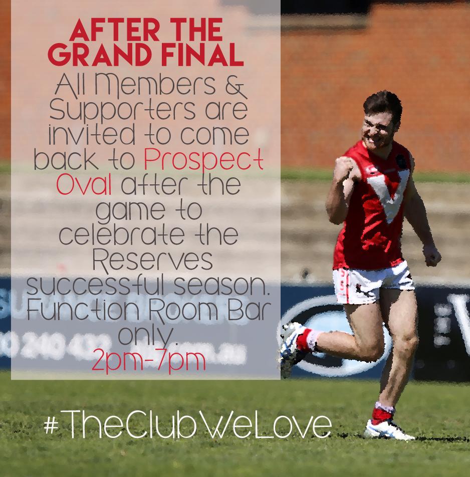 Join us at Prospect Oval for a drink, this Sunday after the Reserves Grand Final!