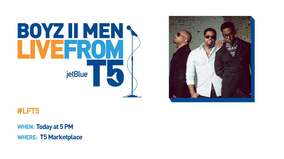 JetBlue Airways tweeted: 1-of-a-kind #TBT Boyz II Men 3 legends: Nathan, Wanya, Shawn Just 4 you, gurl At @JetBlue's T5 today #LFT5